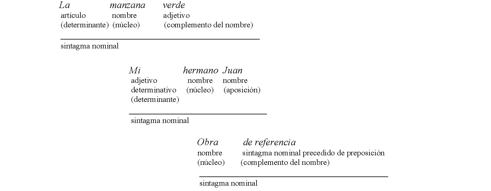 El sintagma nominal consta del núcleo —un sustantivo o una palabra equivalente— y distintas palabras que son