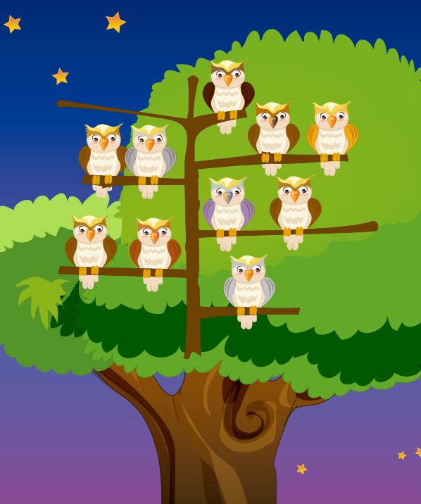 Ten owls are playing at night. Bu, bu! (Repeat)