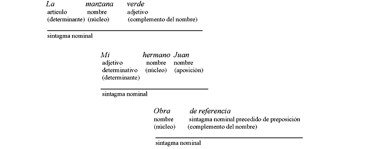 Ejemplo: en La chica rubia vino ayer, la chica rubia es un sintagma nominal que funciona como sujeto de la oración y está formado por el artículo la en función de determinante, el nombre chica en función de núcleo y el adjetivo rubia en función de complemento del nombre.